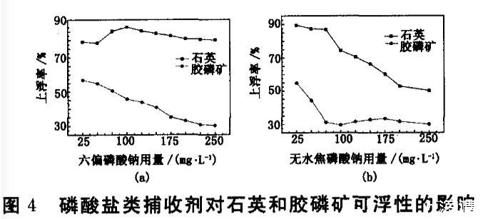 除了上述調整劑,含有磷酸根的六偏磷酸鈉及無水焦磷酸鈉也可抑制膠磷礦,這類磷酸鹽除了可以在酸性條件下抑制膠磷礦外,還能在礦漿中起到一定的分散作用。試驗結果見圖4。