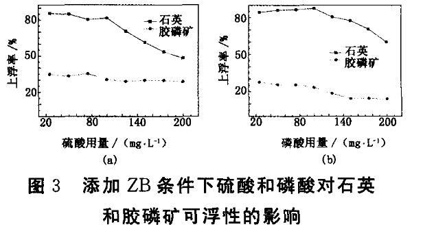 此外使用ZB和硫酸及ZB和磷酸組合的復配藥劑作為調整劑進行試驗,控制ZB用量為150 mg/L,分別考察添加不同用量的硫酸和磷酸對石英和膠磷礦可浮性的影響,結果見圖3。