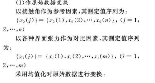 灰色關(guān)聯(lián)分析是通過對統(tǒng)計(jì)序列幾何關(guān)系的比較來分清系統(tǒng)中多因素間的關(guān)聯(lián)程度,序列曲線的幾何形態(tài)越接近,則它們之間的關(guān)聯(lián)度越大。油水、水固、油固界面張力對接觸角影響程度的灰色關(guān)聯(lián)分析步驟如下。