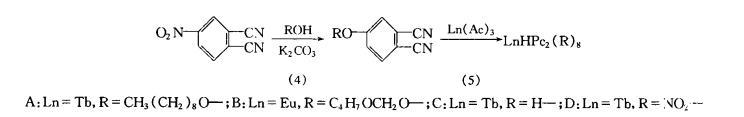 酞酞菁及其金屬配合物因具有較高的化學穩定性、半導體、光導、光伏及氣敏性而受到重視。近年來,稀土雙酞酞菁化合物的研究也有報道。Maskalev等首次發表稀土雙酞酞菁衍生物的合成及其成膜性,劉云圻等人報道了稀土雙酞酞菁衍生物的合成和電化學特性,Aroca等又報道了雙酞酞菁鈰及其LB膜吸附氮氧化物及其表面增強拉曼和紫外-可見光譜特性,但有關這類衍生物未見有良好熒光性的報道。我們合成了4種新型稀土雙酞酞菁衍生物,測定了它們在溶液和LB膜狀態下的熒光特性,并對鄰菲咯啉摻雜形成的混合LB膜進行了研究。