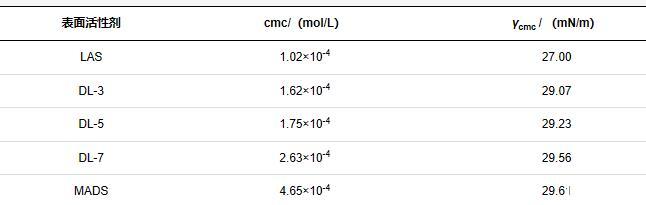 表2給出了混合磺酸鹽的臨界膠束濃度(cmc)和cmc時的表面張力(γcmc),可以看出,LAS展現(xiàn)出最佳的表面活性,隨著混合磺酸鹽中MADS含量的增加,cmc和γcmc呈增加趨勢,這是由于MADS分子中含有2個磺酸基團(tuán),親水性強(qiáng),分子間靜電斥力大,不利于膠束的形成,且在氣/液排列時分子疏松,裸漏的-CH3密度小,即γcmc較高。