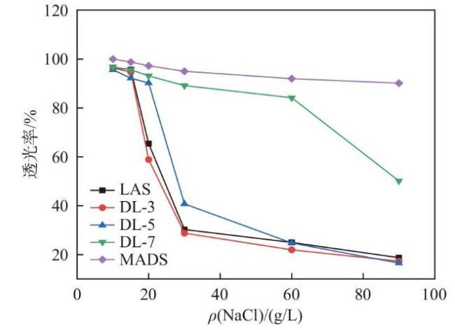 在許多工業(yè)應(yīng)用中,水中含有大量的鹽類,例如在石油天然氣開采、海洋設(shè)備清洗或污水處理等場景中[2,7]。耐鹽型表面活性劑能夠保持在高鹽環(huán)境下的化學(xué)穩(wěn)定性,避免沉淀或失效,確保其清洗能力不受影響,因此探究表面活性劑的耐鹽性有重要意義。圖3給出了LAS、DL-n、MADS的耐鹽性透光率圖,可以看出,LAS的耐鹽性最差,20 g/L NaCl時溶液渾濁,而MADS的耐鹽性最好,隨著混合磺酸鹽中MADS含量的增加,混合磺酸鹽的耐鹽性呈升高趨勢,說明MADS含量的提高有利于提高耐鹽性,這可能是由于無機(jī)鹽對陰離子表面活性劑的作用體現(xiàn)在離子頭基水化層的破壞作用,MADS分子中的雙磺酸結(jié)構(gòu)電荷密度大,屏蔽了NaCl的作用。