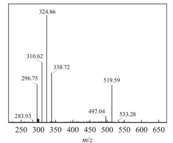 以DL-5為例,MADS的分子量M1=542,LAS為碳鏈C10~13的混合物,M分別是318,332,346,360。由圖1質(zhì)譜圖可以看出,離子峰m/z=519.59為失去一個鈉離子的MADS;離子峰m/z=296.75,310.62,324.86,338.72分別為失去一個鈉離子的C10~13烷基苯磺酸鹽,證明確為烷基二苯醚/烷基苯混合磺酸鹽。