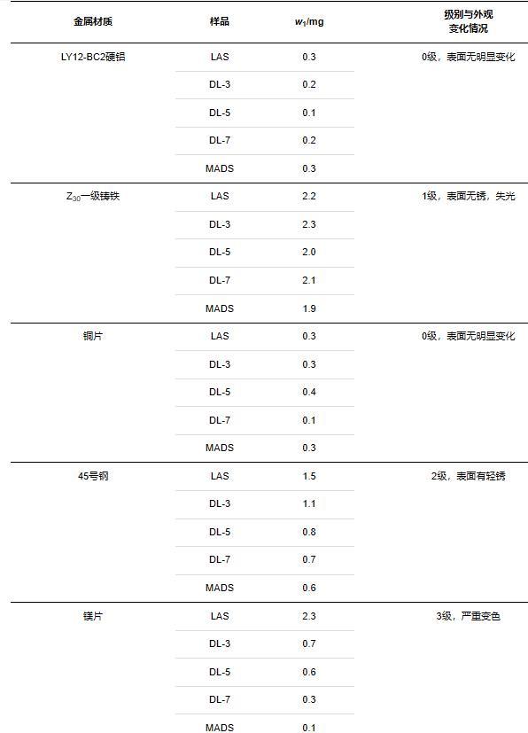 表面活性劑在使用過程中難免會接觸到金屬設(shè)備及容器,存在潛在的腐蝕問題[11]。本研究選用LY12-BC2硬鋁、Z30一級鑄鐵、銅片、45號鋼、鎂片這5種不同的金屬試片來模擬不同的金屬環(huán)境,對LAS、DL-n系列、MADS表面活性劑溶液進(jìn)行金屬腐蝕性測試。通過觀察試片外觀變化以及腐蝕量計算來確定金屬腐蝕性級別。