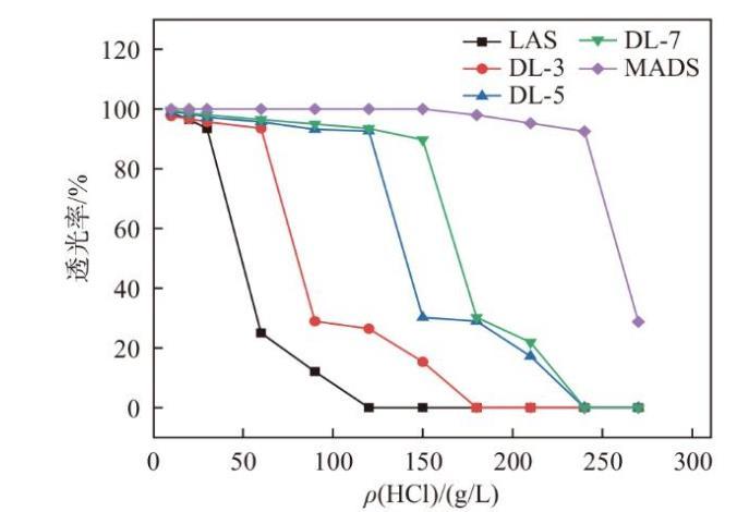 在許多工業(yè)過程中,表面活性劑會接觸到酸性環(huán)境,例如石油開采中的酸化處理、金屬表面處理、酸性清洗劑等[8-10]。研究表面活性劑的耐酸性可以確保這些產(chǎn)品在酸性條件下仍能保持穩(wěn)定性和功能性,從而避免在苛刻條件下失效或分解。磺酸基團(tuán)為C-S鍵,與硫酸鹽類表面活性劑(如AES)相比,在酸性條件下較穩(wěn)定,不易分解。圖4給出了LAS、DL-n、MADS的耐酸性透光率圖,可以看出,隨著混合磺酸鹽中烷基二苯醚含量的增加,耐酸性逐漸增加。LAS耐酸性最差,MADS的耐酸性最好,在270 g/L時渾濁。混合磺酸鹽在結(jié)構(gòu)上并沒有發(fā)生破壞,發(fā)生渾濁是由于聚集體形態(tài)發(fā)生了變化,從而體現(xiàn)出溶液渾濁的現(xiàn)象。