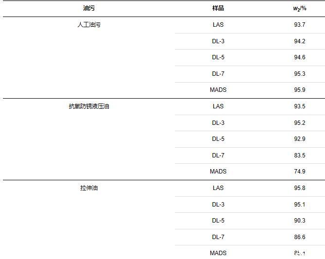 金屬凈洗力是指表面活性劑溶液在金屬表面去除污垢、油脂或其他污染物的能力,表面活性劑的金屬凈洗力直接影響其在工業(yè)清洗中的效果[12,13]。本研究選擇人工油污、抗氧防銹液壓油以及拉伸油模擬不同的工業(yè)場景,探究其對LAS、DL-n系列、MADS表面活性劑溶液凈洗力的影響。實(shí)驗(yàn)結(jié)果如表4所示,可以看出:對于人工油污,隨著混合磺酸鹽中MADS含量的增多,凈洗力整體差異不大,都維持在90%以上;對于抗氧防銹液壓油與拉伸油,隨著混合磺酸鹽中MADS含量的增多,表面活性劑溶液親水性增加,對抗氧防銹液壓油、拉伸油乳化能力下降,凈洗力逐漸降低。