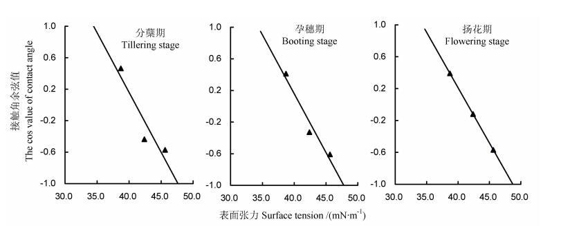 通過Delta-8表面張力儀直接測(cè)定,分蘗蘗期、孕穗期、揚(yáng)花期水稻葉片的臨界表面張力值分別為34.46、34.36和34.33 mN/m。結(jié)果如圖2所示,清晰展示了不同生育期的差異。