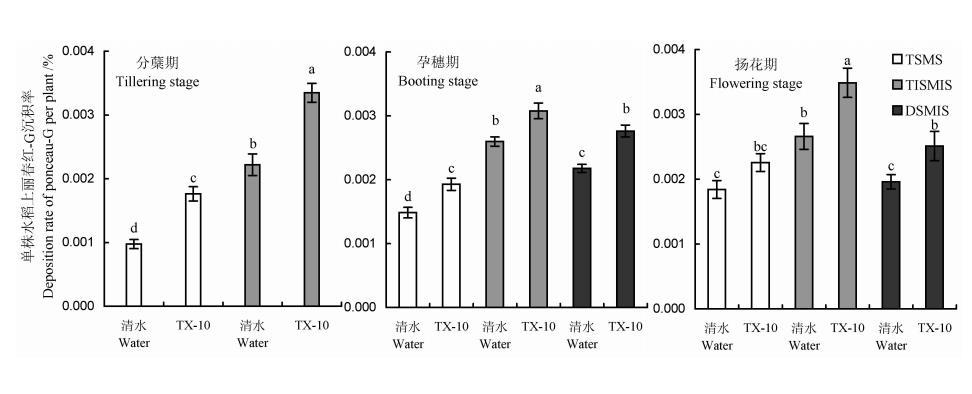 清水的表面張力為71.80mN/m,用清水配制的麗春紅-G溶液的表面張力高于水稻葉片臨界表面張力。用100mg/LTX-10溶液配制的麗春紅-G溶液表面張力低于水稻葉片臨界表面張力。從圖4可以看出,與噴灑清水配制的麗春紅-G溶液相比,在水稻3個(gè)生育期,采用相同噴霧方法噴灑TX-10溶液配制的麗春紅-G溶液,都增加了水稻植株上麗春紅-G的沉積率。以在水稻生長量較小的分蘗蘗期增加幅度最大,其中手動(dòng)噴霧器壓頂噴霧增加了80.85%,彌霧機(jī)下傾噴霧增加了50.83%,差異達(dá)顯著水平(F=57.17>F0.01=26.18,df=3,116,P<0.01)。