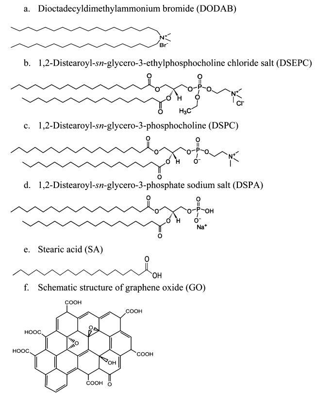 正電荷脂質(zhì)二十八烷基二甲基溴化銨(DODAB)和1,2-二硬脂酰-sn-甘油-3-乙基磷酸膽堿氯化鹽(DSEPC)、中性電荷兩性脂質(zhì)1,2-二硬脂酰-sn-甘油-3-磷酸膽堿(DSPC)和負(fù)電荷脂質(zhì)1,2-二硬脂酰-sn-甘油-3-磷酸鈉鹽(DSPA)購自Avanti Polar Lipides(Alabaster,AL)。硬脂酸(SA)購自SigmaAldrich(密蘇里州圣路易斯)。由于頭部基團(tuán)中存在陰離子磷酸鹽和陽離子季銨中心,DSPC帶中性電荷,如方案1c所示。由于羧基脫質(zhì)子化,SA被認(rèn)為是帶負(fù)電的分子。所有這些脂質(zhì)在非極性尾部都有18個(gè)碳鏈烷基。光譜級(jí)氯仿和甲醇來自MP Biomedicals(Solon,OH)。單層GO購自ACS Material LLC(馬薩諸塞州梅德福德)。所有這些化學(xué)品均未經(jīng)任何進(jìn)一步凈化。化學(xué)結(jié)構(gòu)如圖1所示。實(shí)驗(yàn)中使用的去離子水來自Modulab 2020水凈化系統(tǒng)(德克薩斯州圣安東尼奧)。去離子水的電阻率、表面張力和pH值在20.0±0.5°C時(shí)分別為18 MΩ·cm、72.6 mN/M和5.6。所有實(shí)驗(yàn)均在恒溫20.0±0.5°C、濕度50±1%的潔凈室(1000級(jí))中進(jìn)行。