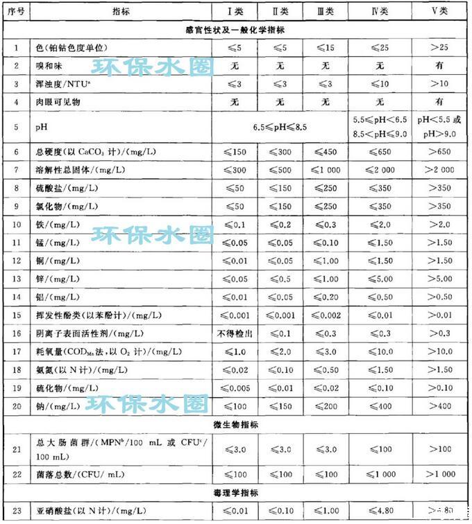 依據(jù)我國(guó)地下水質(zhì)量狀況和人體健康風(fēng)險(xiǎn),參照生活飲用水、工業(yè)、農(nóng)業(yè)等用水質(zhì)量要求,依據(jù)各組分含量高低(pH除外),分為五類(lèi)。